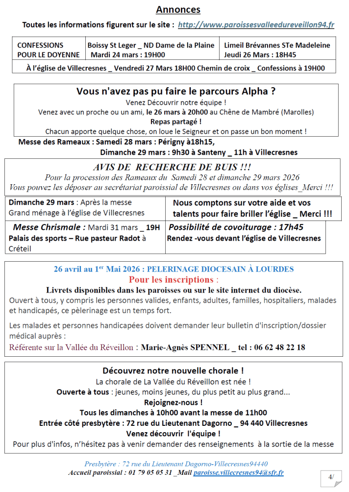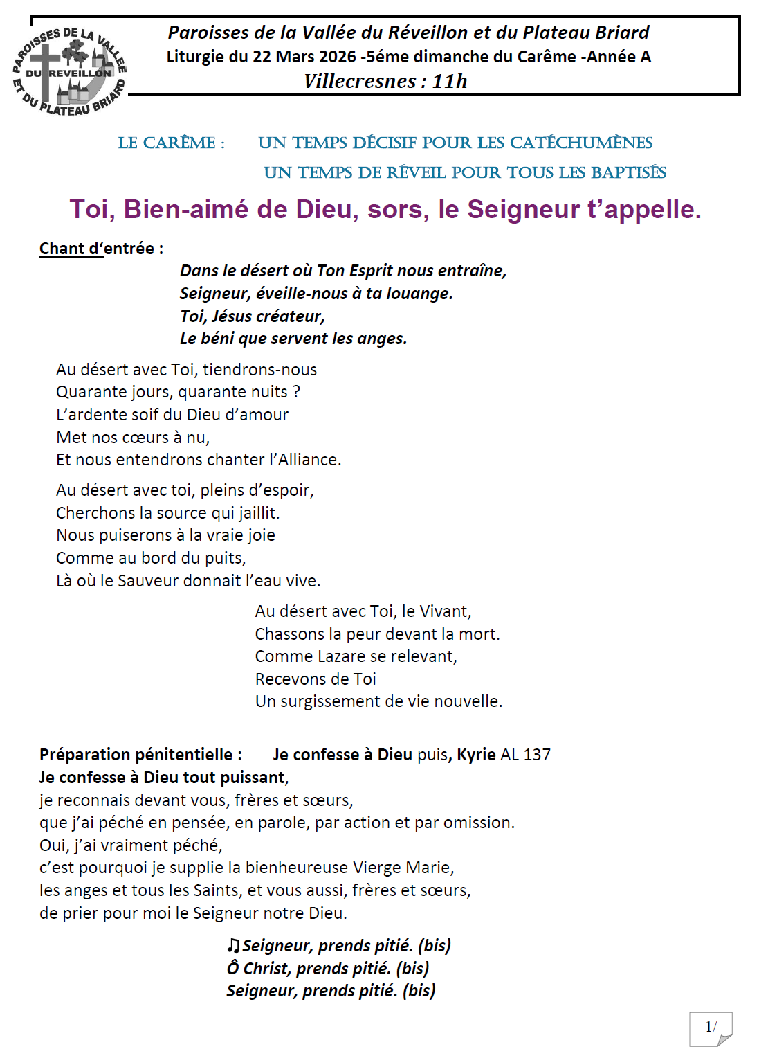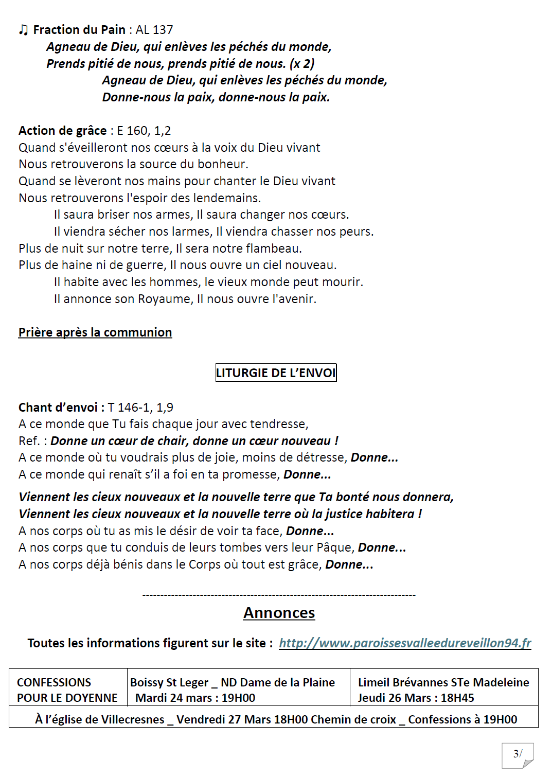 - Pour la célébration du dimanche 22 mars, à Villecresnes: voir juste après
