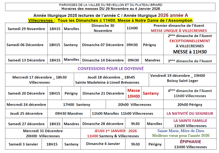 Horaires des messes dominicales : période du 29 novembre 2025 au 04 janvier 2026